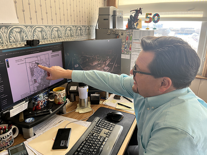 News Photo by Steve Schulwitz Alpena City Engineer Steve Shultz looks at design plans for a road project in Alpena. The city has several large projects in the works for this year and next.