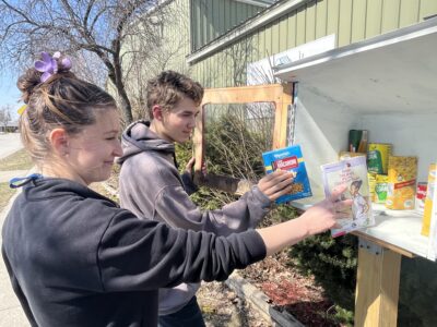 News Photo by Steve Schulwitz Alicia Hawley, director of the Youth Volunteer Corps at the Boys and Girls Club of Alpena, places a book into a community donation box while Skyler Wininger adds some food. The box is located outside the club.