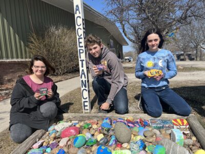 News Photo by Steve Schulwitz Rachelle Fleck, left, Skyler Wininger, center, and Aeris Snyder hold rocks they decorated in a rock garden near the entrance to the Boys and Girls Club of Alpena.