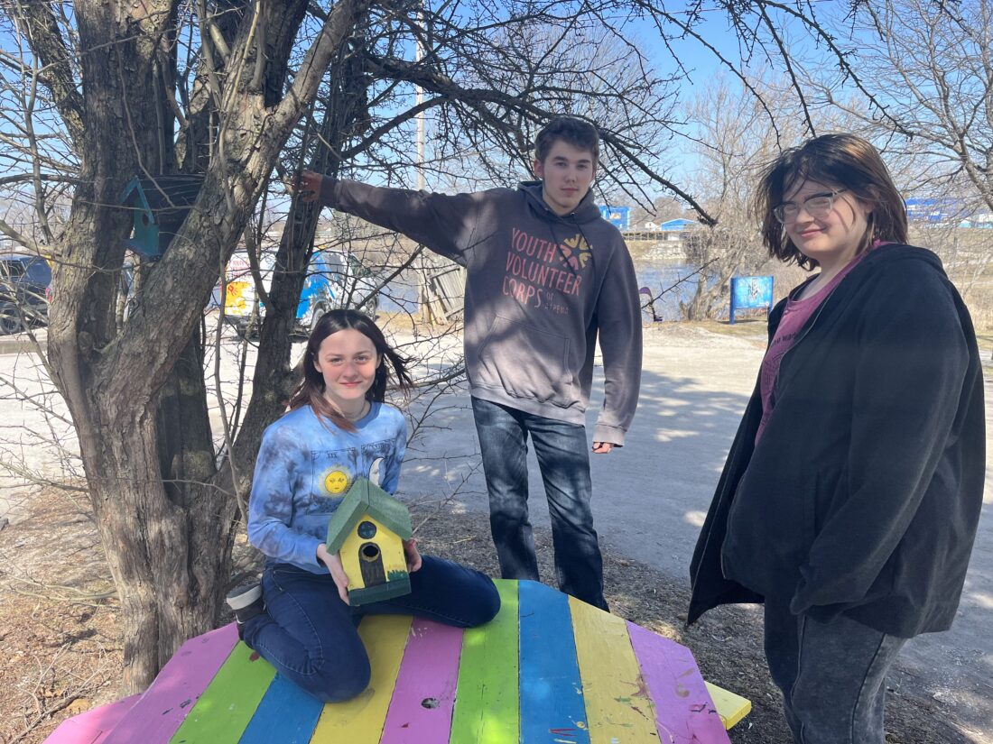 News Photo by Steve Schulwitz Youth Volunteer Corps of Alpena members Aeris Snyder, left, Skyler Wininger, center, and Rachelle Fleck show off one of the birdhouses they built at the Boys and Girls Club of Alpena. The teens volunteer their time at places like the Huron Humane Society and Turning Brook.