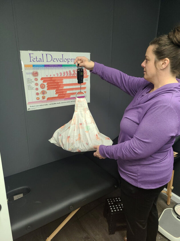 Courtesy Photo Lineage Midwifery owner and midwife Val Meharg weighs a newborn baby in a sling recently. The new business in Rogers City provides alternate birthing services that hospitals and healthcare systems don’t at a more affordable cost.