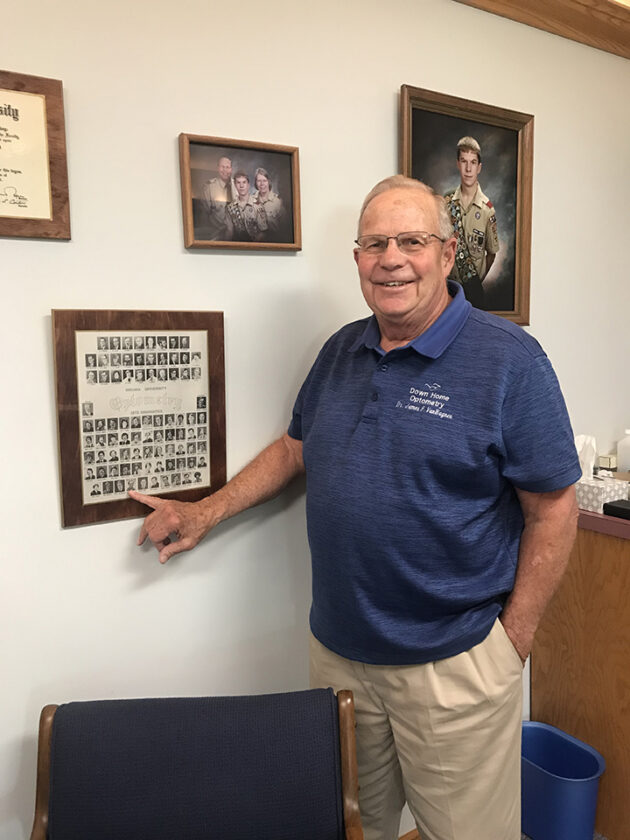 News Photo by Darby Hinkley Dr. James Van Wagnen, owner of Down Home Optometry in Alpena, stands in his office pointing to a picture of his 1973 graduating class from Indiana University. Van Wagnen has been in practice for 50 years, and plans to continue for as long as he is able.