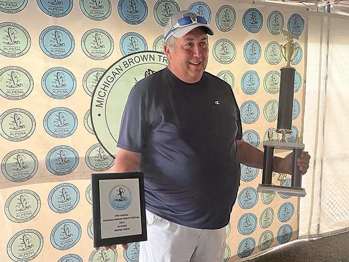News Photo by Steve Schulwitz Terry McConnel poses for photos with a trophy and plaque in hand after winning the 2023 Michigan Brown Trout Festival tournament. He received his prizes at a ceremony on Sunday in Alpena.