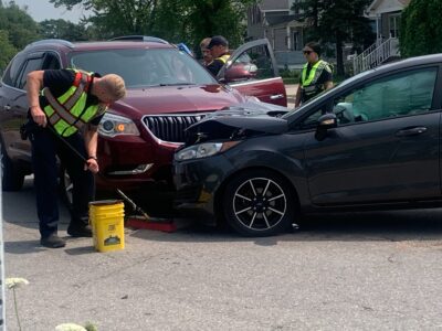 News Photo by Temi Fadayomi Alpena first responders clean up debris from a two-vehicle collision at the intersection of Ripley Boulevard and 9th Avenue around noon on Tuesday. According to Alpena Police Sergeant Donald Leaym, the crash was a result of the car coming in from 9th Avenue failing to yield to the car coming in on Ripley Boulevard. Three people were taken from the scene and transported to MyMichigan Medical Center Alpena on stretchers.