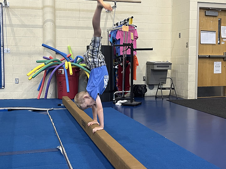 News Photo by Steve Schulwitz William Stafford does a cartwheel on a balancing beam at the APlex on Tuesday.