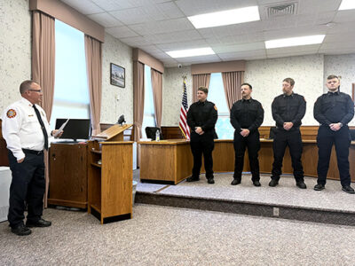 News Photo by Steve Schulwitz At a special pinning ceremony on Thursday, Alpena Fire Chief Rob Edmonds, left, introduces four new firefighters hired into the department. From left to right are Nick Adamiak, Lee Babcock, Chris Kinsey, and Adam McNeill. A large gathering of city officials, police and fire personnel, and friends and family attended the ceremony to support the new employees.