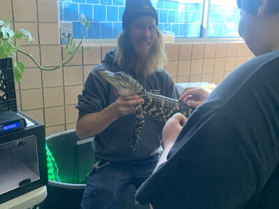 - News Photo by Temi Fadayomi Northern Michigan Exotic Animal Expo co-host Michael Wilson presents an American alligator named Gatorade to expo attendees at the APlex on Sunday.
