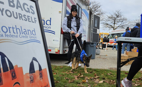 - News Photo by Mike Gonzalez Ashley Bloom, a worker of Northland Area Federal Credit Union, holds the leash of a German shepherd at the company’s Alpena trunk-or-treat spot in the parking lot behind City Hall on Saturday.
