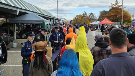 - News Photo by Mike Gonzalez Troopers from the Michigan State Police-Alpena Post hand out treats to lined-up participants at the Alpena trunk-or-treat event on Saturday.