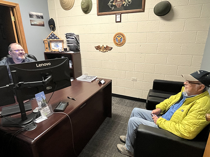 News Photo by Steve Schulwitz Alpena County Veterans Officer Dan Perge, left, offers help to Marine veteran Mike Stentoumis last week. Stentoumis had some questions about a government program that assists veterans and met with Perge to get his questions answered.