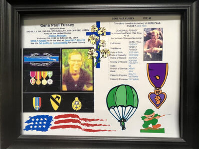 News Photo by Steve Schulwitz A memorial dedicated to an Army veteran from Alpena hangs on the wall at the Alpena County Department of Veterans Affairs office. The memorial honoring Gene Fussey is one of several dozen paying tribute to veterans for their service.