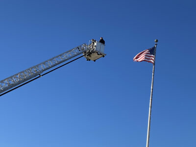 PHOTO GALLERY: School, public safety officials take sky ride to hang new flag