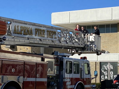 - News Photo by Darby Hinkley Alpena Public Schools Superintendent Dave Rabbideau, left, Alpena Fire Department Community Risk Reduction Capt. Andy Marceau, center, and Alpena High School Principal Romeo Bourdage take a high ride in the boom attached to an Alpena Fire Department fire truck on Friday morning after a Veterans Day ceremony at Alpena High School. Alpena police officers participated in the ceremony, which included flying a brand-new, large American flag over Alpena High from the telescoping boom extending from the fire truck.