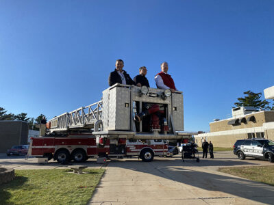 Alpena Public Schools Superintendent Dave Rabbideau, left, Alpena Fire Department Community Risk Reduction Capt. Andy Marceau, center, and Alpena High School Principal Romeo Bourdage take a high ride in the boom attached to an Alpena Fire Department fire truck on Friday morning after a Veterans Day ceremony at Alpena High School. Alpena police officers participated in the ceremony, which included flying a brand-new, large American flag over Alpena High from the telescoping boom extending from the fire truck.