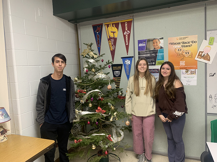 News Photo by Temi Fadayomi Alpena High School foreign exchange students, from left to right, Santiago Diaz Teran, Camille Pages, and Sara Couto Vasquez pose by a Christmas tree at Alpena High School on Thursday.