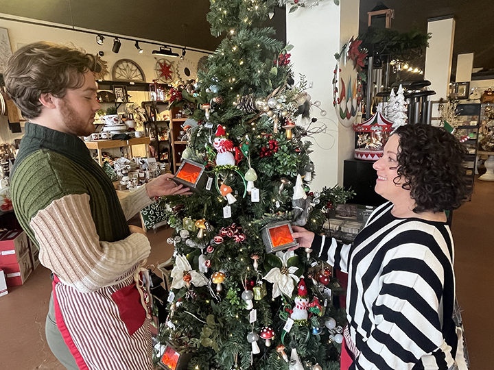 News Photo by Steve Schulwitz Teegan Birch, left, and Rusty Petunias Market owner Laura Shearer look at Christmas tree ornaments displayed on a Christmas tree in the store in Alpena on Wednesday. Shearer said the revenue from holiday business helps carry her through the slow months later in the winter.