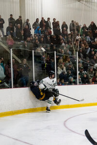 - News Photo by Steve Jakubcin Alpena High School’s Gavin Winterstein checks a Cadillac player into the wall during the Wildcats’ Friday night game against Cadillac at Northern Lights Arena in Alpena. The Wildcats won 7-1.