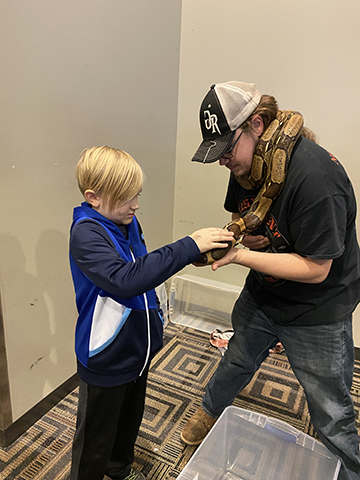 News Photo by Darby Hinkley Emmett Miller, 8, pets a Columbian red-tail boa constrictor draped around the neck of Blake Kaple of Banksy Reptiles out of Pennsylvania, who traveled over 550 miles to participate in Saturday's Northern Michigan Exotic Animal Expo at the APlex in Alpena.