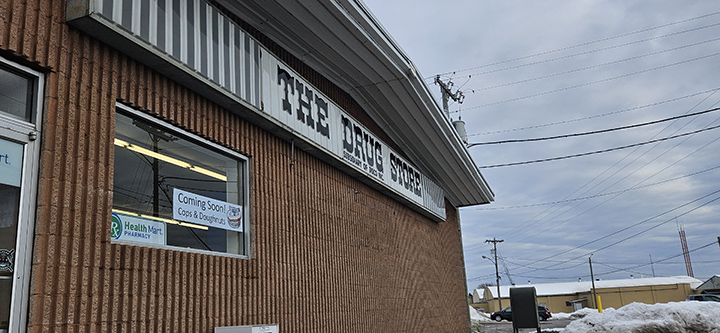 News Photo by Mike Gonzalez A sign that says, “Coming Soon! Cops & Doughnuts,” is posted on the window of the Drug Store Health Mart Pharmacy on Thursday on U.S.-23 South. The original owners of the Substation on West Washington Avenue are retiring, so new owners are taking the Cops and Doughnuts partnership to the new location, starting March 1.