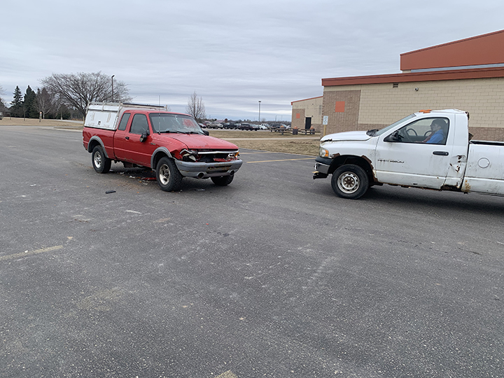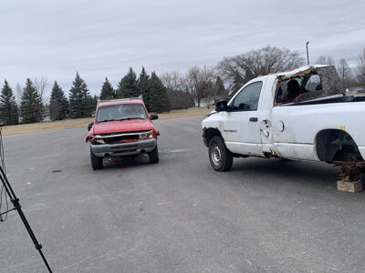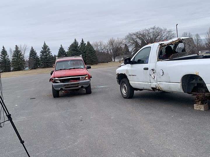 - News Photo by Steve Jakubcin Two Student Leading Students volunteers sit in one of the vehicles used during Hillman’s impaired driving reenactment assembly on Friday at Hillman.
