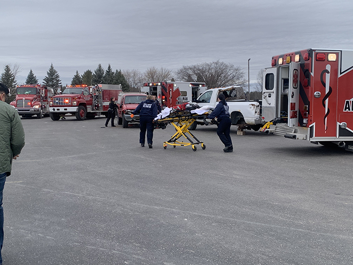 News Photo by Temi Fadayomi Emergency Medical Services personnel with Hillman ambulances bring out a stretcher as part of the impaired driving reenactment assembly being held at the Hillman High School parking lot on Friday.