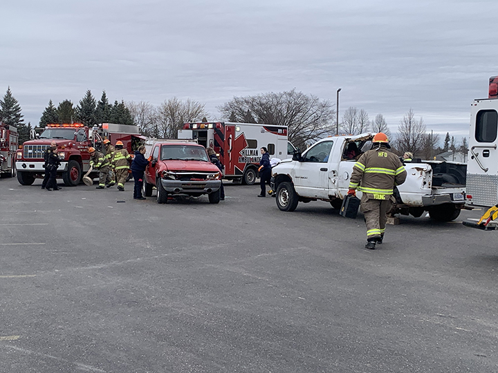 - News Photo by Temi Fadayomi Members of the Hillman Area Fire Department make their way over to the damaged cars as part of the impaired driving reenactment assembly being held at the Hillman High School parking lot on Friday.