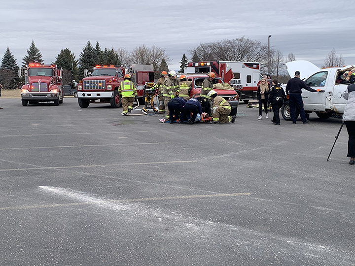 News Photo by Temi Fadayomi Members of the Hillman Area Fire Department and Emergency Medical Services personnel with Hillman ambulances treat a Students Leading Students volunteer as part of the impaired driving reenactment assembly being held at the Hillman High School parking lot on Friday.