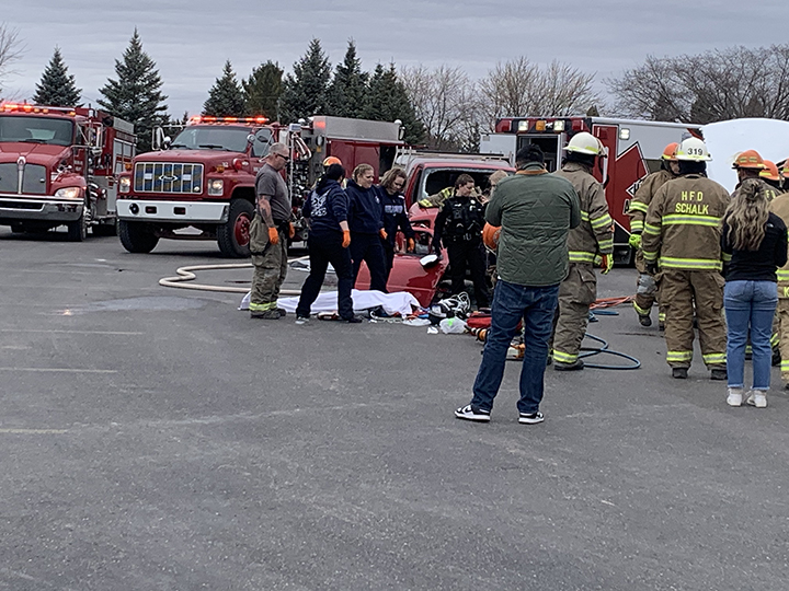 News Photo by Temi Fadayomi Members of the Hillman Area Fire Department make their way over to the damaged cars as part of the impaired driving reenactment assembly being held at the Hillman High School parking lot on Friday.