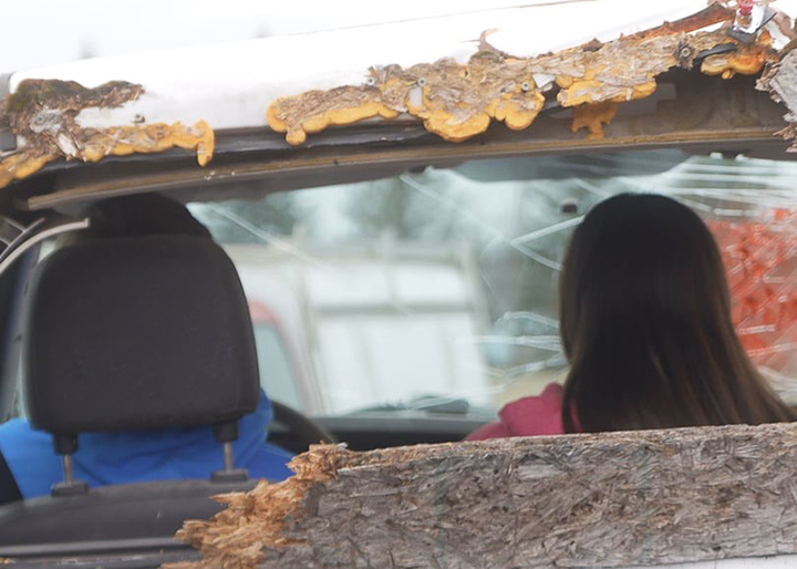 - News Photo by Temi Fadayomi Students Leading Students members sit inside damaged cars as part of the impaired driving reenactment assembly being held at the Hillman High School parking lot on Friday.