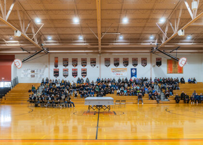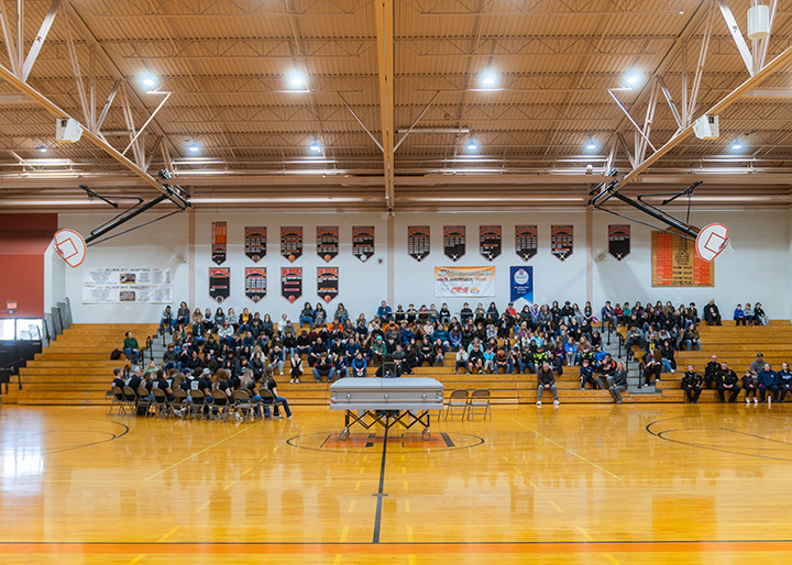 - News Photo by Steve Jakubcin Students sit in Hillman High School’s gymnasium during their impaired driving reenactment assembly on Friday. The students were ushered into the gymnasium where the SLS volunteer who was “pronounced dead” on the scene was given a mock funeral to emphasize the loss that comes with accidents of this nature.