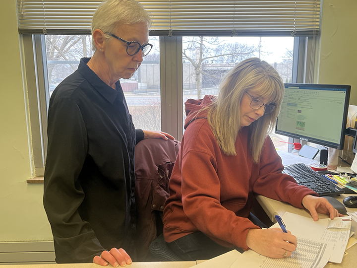 News Photo by Steve Schulwitz Alpena County Treasurer Kim Ludlow, left, works with Deputy Treasurer Cindy Cebula in the Treasurer’s Office on Friday. Ludlow will not seek another term later this year and voters will decide her replacement during the upcoming elections in August and November.