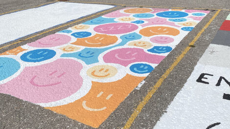 News Photo by Torianna Marasco A senior’s parking spot is seen painted with smiley faces on Tuesday. The design is a bright and fun way for the student to see each morning as they arrive for class.