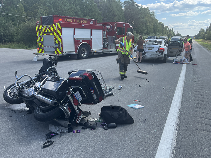 News Photo by Steve Schulwitz Emergency crews work to clean up the scene of a motorcycle-versus-car wreck on U.S.-23 South this afternoon.