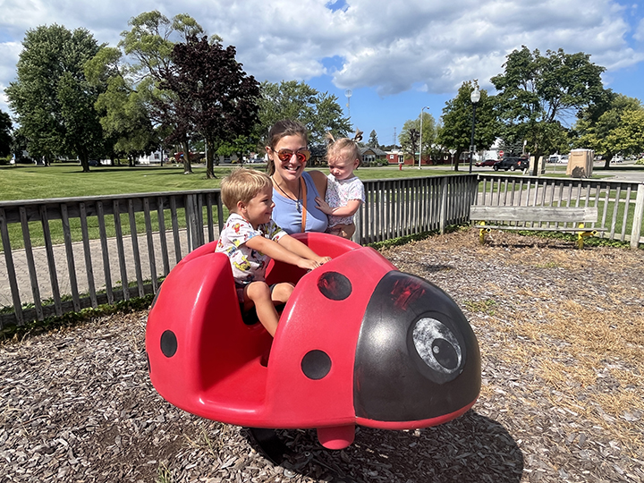 News Photo by Steve Schulwitz Jack Johnston, left, Autumn Johnston, center, and Lyla Kuligowski enjoy Thursday afternoon at the Kiwanis Kiddie Park in Alpena. Parks in Northeast Michigan will be popular hangouts for the next five days as temperatures are forecasted to climb into the high 80s and low 90s.