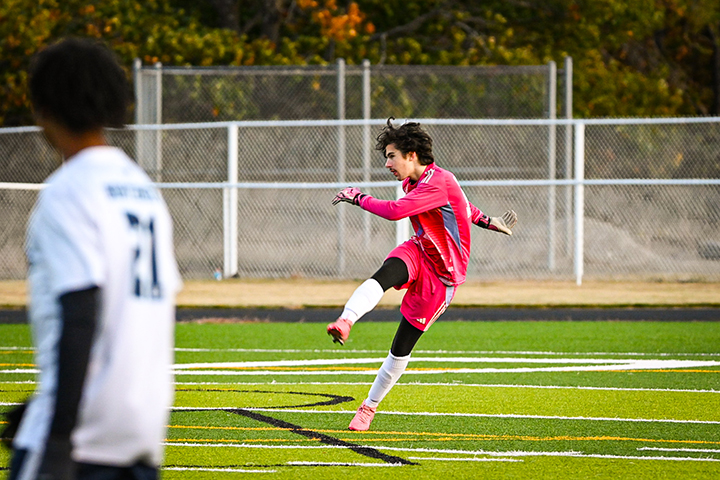 News Photo by Leslianne Johns Alpena’s goalie Drake Wheelock kicks the ball during Tuesday’s game against Petoskey in Alpena. Despite their previous win against the Northmen, the Wildcats lost 2-1, ending their season.
