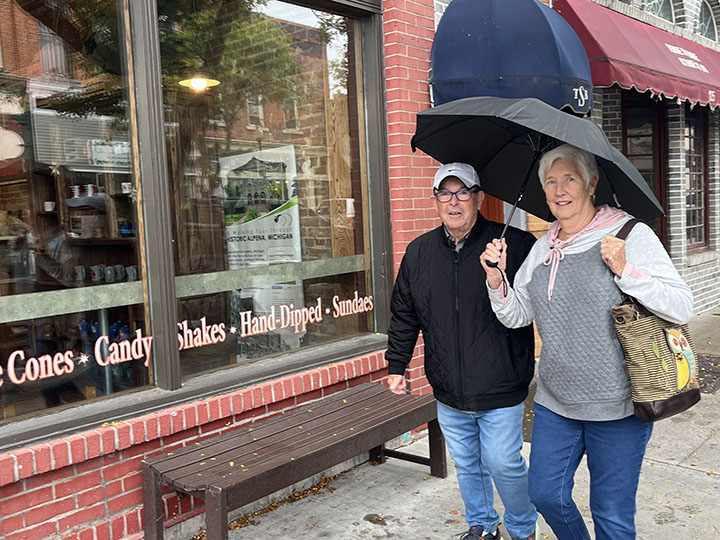 News Photo by Steve Schulwitz Bill Turnbull, left, and his wife Nancy Turnbull use an umbrella while walking through downtown Alpena during a light rain on Tuesday. Despite the precipitation, much of Northeast Michigan is classified as being in a moderate drought.