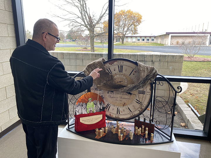 News Photo by Torianna Marasco Brian Schorn, an art and design instructor at the college, explains a piece of artwork at the Northeast Michigan Artist Guild exhibit at Alpena Community College on Wednesday. The piece is titled “Legacy” by Erynn Ziegler.