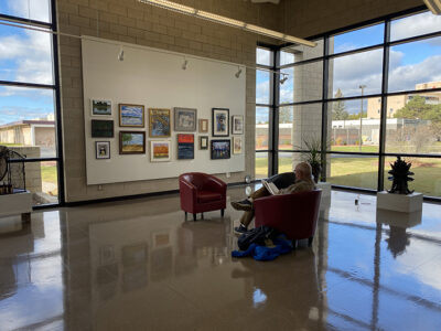 News Photo by Torianna Marasco A man reads in the Alpena Community College Olin H. Joynton Fine Arts Center gallery on Wednesday. The gallery is currently showcasing art from Northeast Michigan Artist Guild artists.