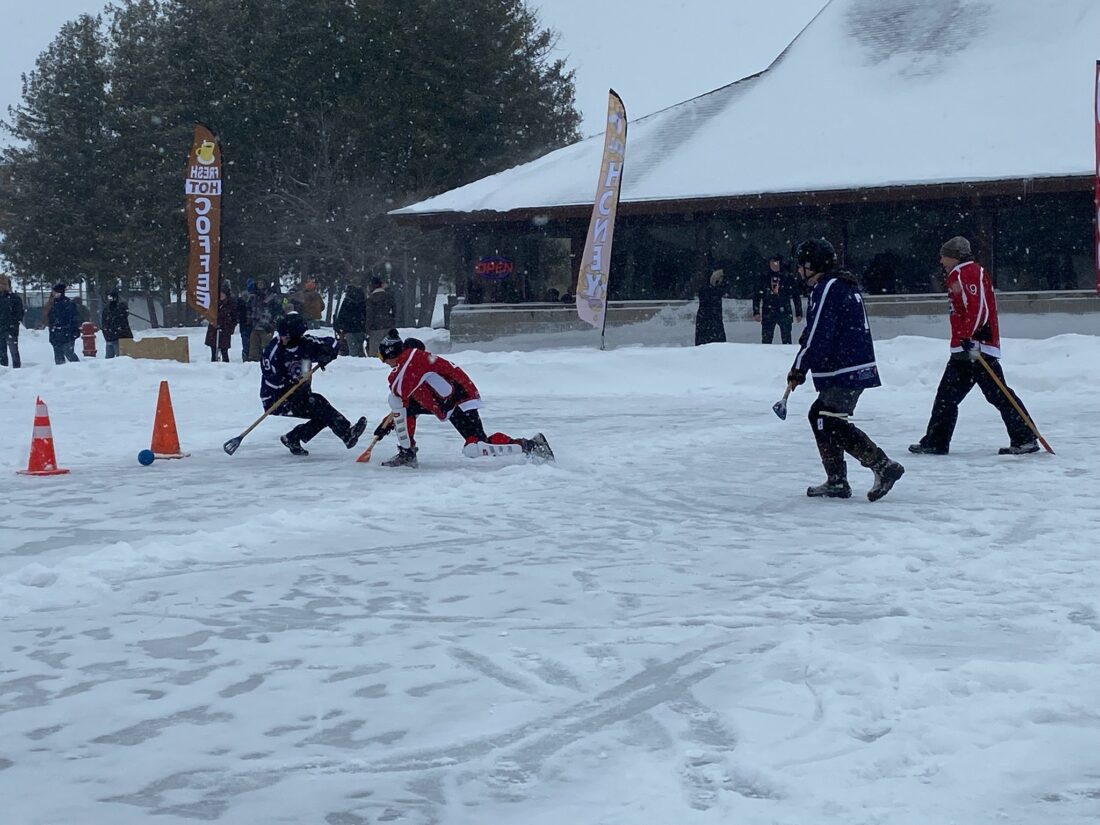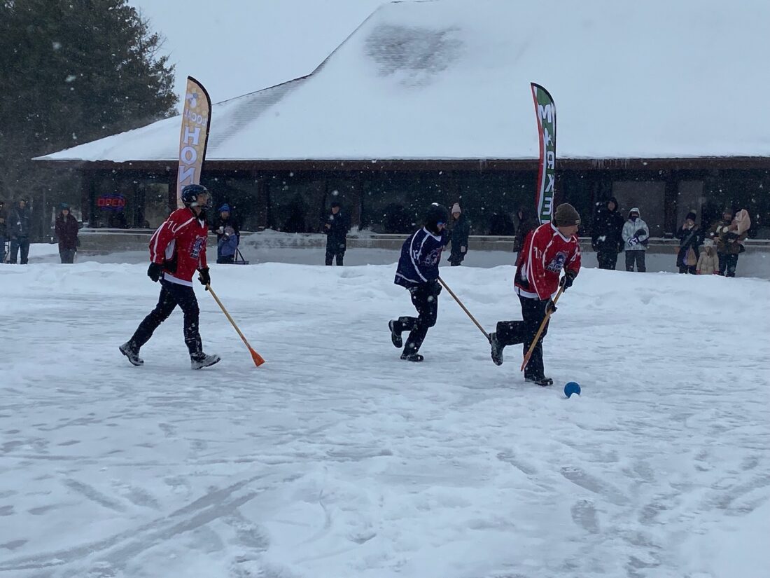 News Photo by Darby Hinkley The Alpena Police and Alpena Fire departments play in a broomball game on the ice on Saturday at Mich-e-ke-wis Park during the Alpena Ice Festival. The police team emerged victorious, beating the fire team 5 to 2, but it was a friendly game and fun for participants and spectators.