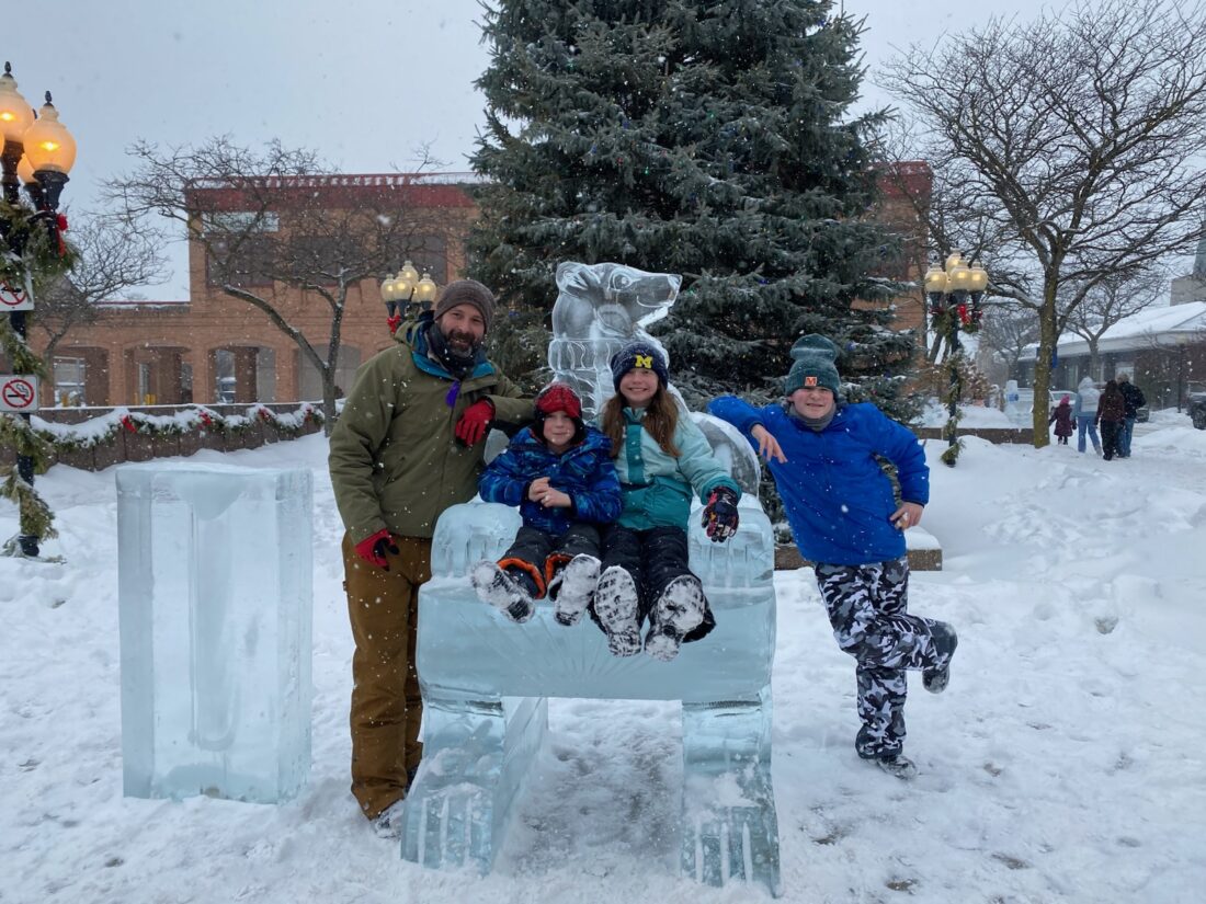 News Photo by Darby Hinkley Many people took turns sitting on the ice throne at Culligan Plaza in downtown Alpena. Pictured, from left, are John Wysocki III, Robert Wysocki, Amelia Garant, and John Wysocki IV.