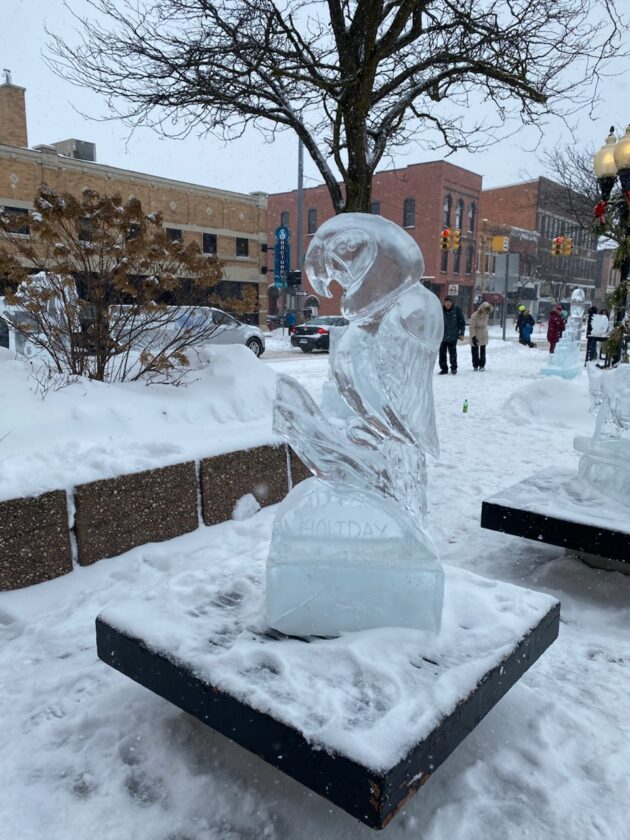 Over 70 ice sculptures were on display around town, with some at Mich-e-ke-wis, some at Culligan Plaza, and more throughout the city in front of businesses that sponsored the sculptures, each created uniquely to represent the sponsoring organization.