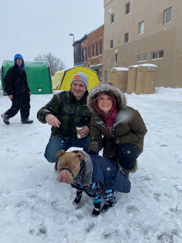 News Photo by Darby Hinkley Even dogs were bundled up on Saturday at the Alpena Ice Festival. Pictured are Louie the pitbull, wearing pajamas, booties, and a coat, with owners Matt Seguin and Mariah Seguin in downtown Alpena.