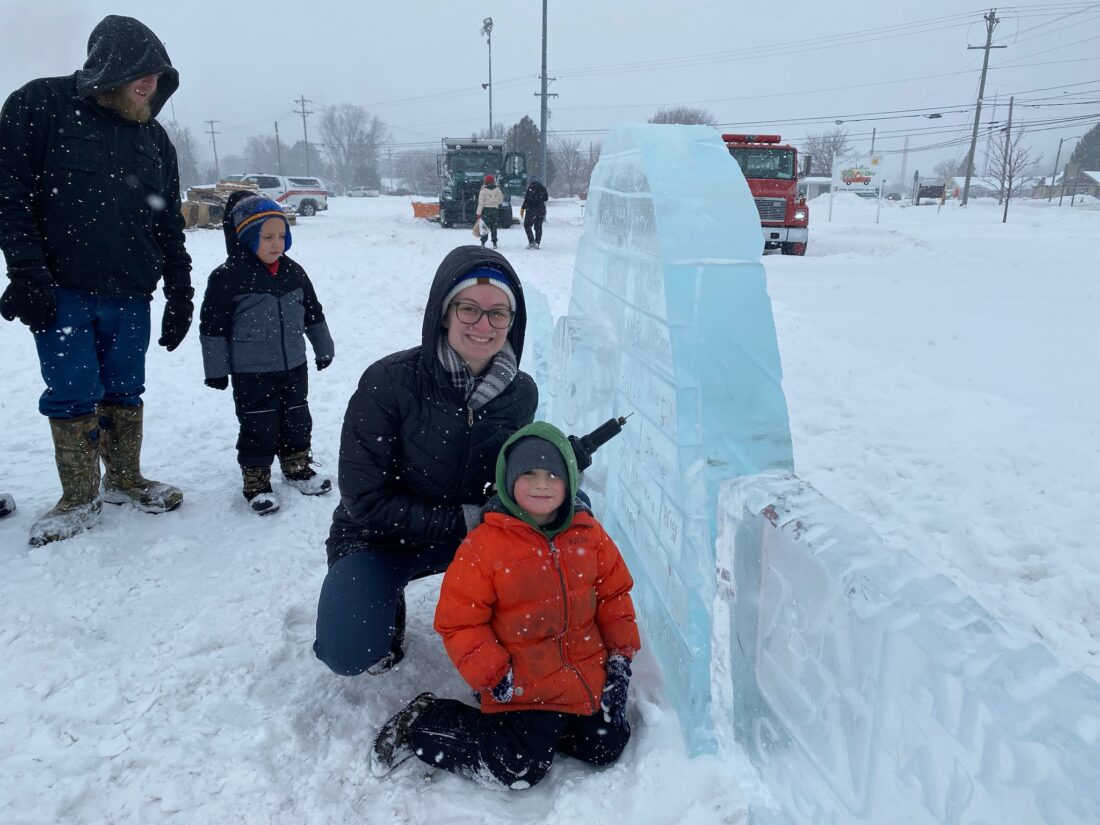 News Photo by Darby Hinkley Caroline Denlinger with Alpena Alcona Area Credit Union helps a child use a tool to carve his name into an ice sculpture at Mich-e-ke-wis Park during the Alpena Ice Festival.