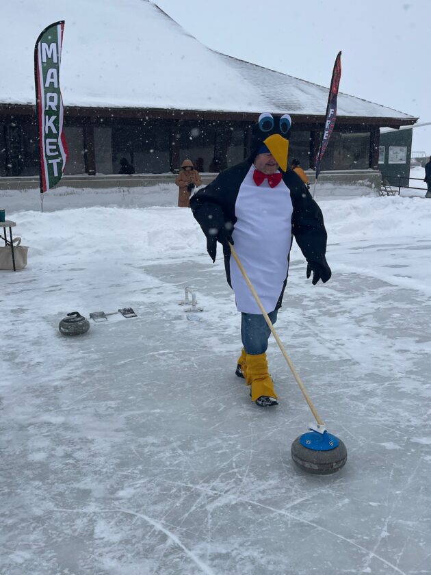 - Courtesy Photo In this photo provided by Diane O’Connor, a penguin (Tim Kuehnlein of Thunder Bay Arts) learns to curl on the ice at Mich-e-ke-wis Park during the Alpena Ice Festival. Thunder Bay Curling Club offered the opportunity for attendees to try their hand at curling.
