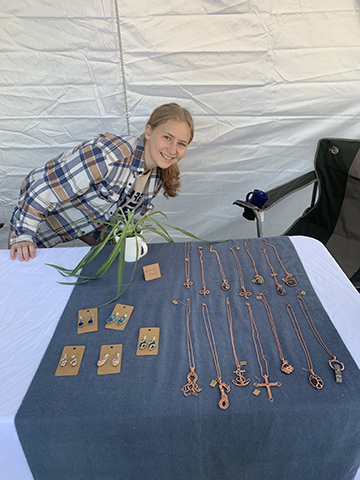Courtesy Photo Emma Schroeder poses beside some of her custom-made jewelry on display in this courtesy photo. The Alcona High School junior has been making jewelry since 2021.