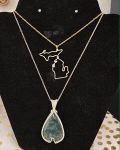 - News Photo by Shell Hoffman A wire necklace shaped into the state of Michigan and another custom jewelry piece, both created by Emma Schroeder.