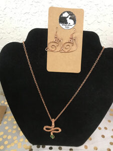 News Photo by Shell Hoffman A pair of earrings and a necklace created by Emma Schroeder are seen on display at Hollyhock Emporium of Harrisville.