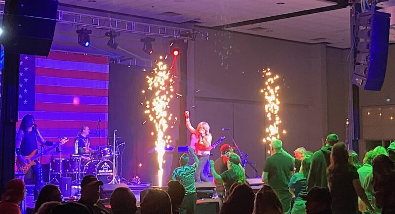 A musician sings a Poison song while pyrotechnics go off on stage on Saturday night at the APlex in Alpena. The concert featured Armageddon, paying tribute to Def Leppard, Poison, and Ratt, playing many songs by each of those rock bands. Hundreds of people attended the concert, singing and dancing to the music.