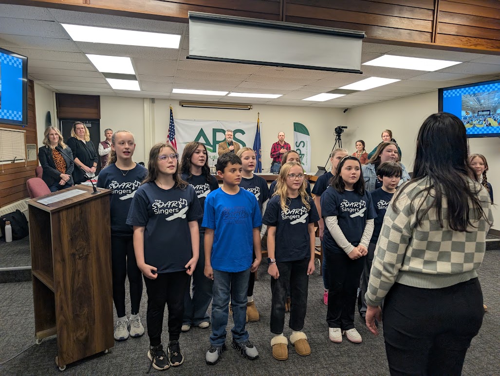 News Photo by Reagan Voetberg The Ella White SOAR Singers sang the national anthem at the Alpena Public Schools board of education regular meeting on Monday night. The SOAR Singers are a choir of fifth grade students at Ella White Elementary that started last school year.