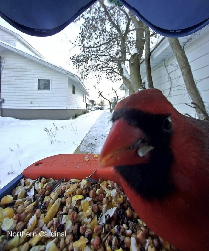 Photo by Megan Riopelle A cardinal looks directly into a birdfeeder camera with a mouth beak full of bird food. This photo was submitted to The News by Megan Riopelle earlier this week.